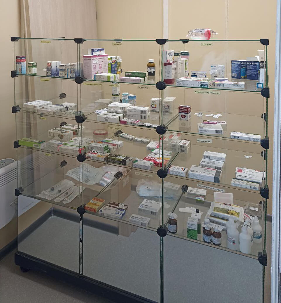Внутреннее оснащение предусмотрено для оказания первой помощи, а также кабинетами для приема амбулаторных пациентов.